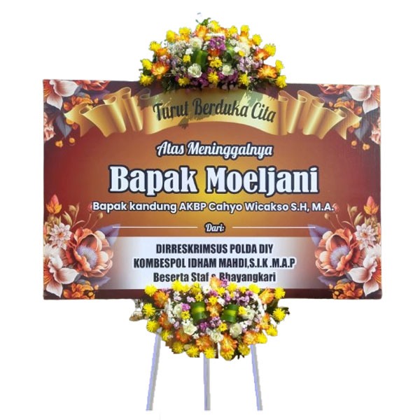 Karangan bunga papan printing ukuran 2 m x 1,25 m dengan bunga artificial & segar untuk bunga papan di Banyuwangi dan sekitarnya. Bunga papan wedding banyuwangi, bunga papan duka cita banyuwangi, bunga papan selamat & sukses/congratulations banyuwangi.