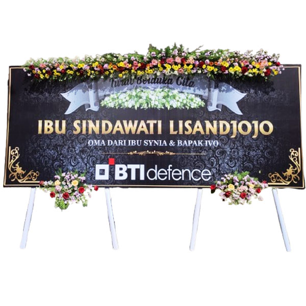 Karangan bunga papan printing ukuran 130 x 380 cm dengan bunga artificial & segar untuk bunga papan di Banyuwangi dan sekitarnya. Bunga papan wedding banyuwangi, bunga papan duka cita banyuwangi, bunga papan selamat & sukses/congratulations banyuwangi.