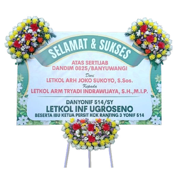 Karangan bunga papan printing ukuran 2 m x 1.25 m dengan bunga artificial & sgear untuk bunga papan di Banyuwangi dan sekitarnya. Bunga papan wedding banyuwangi, bunga papan duka cita banyuwangi, bunga papan selamat & sukses/congratulations banyuwangi.