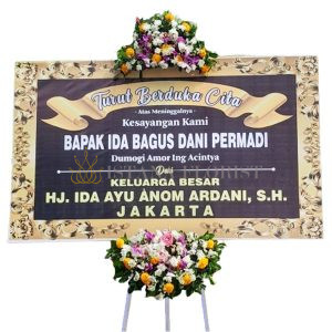 Karangan bunga papan ukuran 1 x 2 m bunga 2 titik memanjang untuk bunga papan di Denpasar dan sekitarnya. Untuk bunga papan pernikahan, bunga papan duka cita, bunga papan selamat & sukses/congratulations.