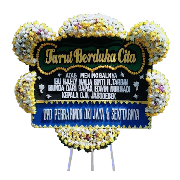 - Karangan bunga papan ukuran panjang 2 meter x tinggi 1,25 meter.