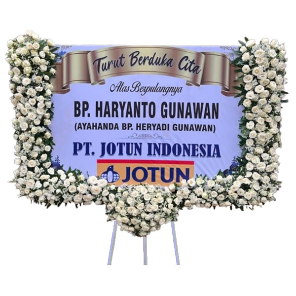 Karangan bunga papan printing ukuran 225 x 140 cm dengan bunga full segar membingkai papan untuk bunga papan di Malang dan sekitarnya.