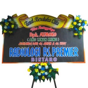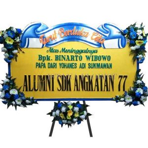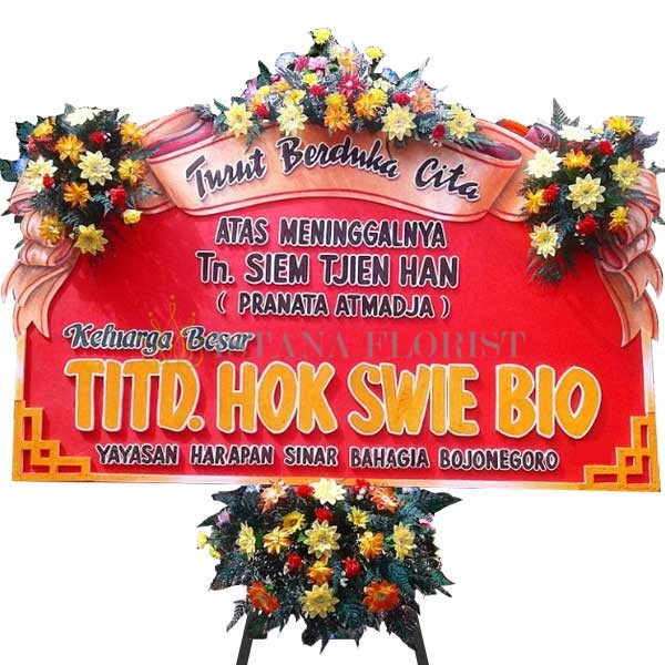 Karangan bunga papan ukuran panjang 2,2 meter x tinggi 1,3 meter dengan 4 titik bunga palsu untuk bunga papan di Bojonegoro dan sekitarnya. Untuk bunga papan pernikahan, bunga papan duka cita, bunga papan selamat & sukses/congratulations.