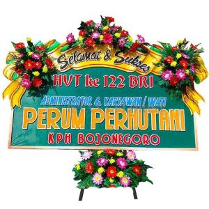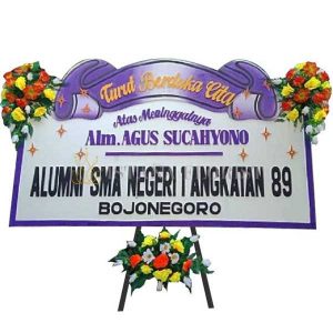 Karangan bunga papan ukuran 2,2 meter x 1,4 meter dengan 5 titik bunga palsu untuk bunga papan di Bojonegoro dan sekitarnya. Untuk bunga papan pernikahan, bunga papan duka cita, bunga papan selamat & sukses/congratulations.