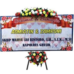Karangan bunga papan ukuran panjang 2,2 meter x tinggi 1,3 meter dengan 2 titik bunga palsu untuk bunga papan di Bojonegoro dan sekitarnya. Untuk bunga papan pernikahan, bunga papan duka cita, bunga papan selamat & sukses/congratulations.