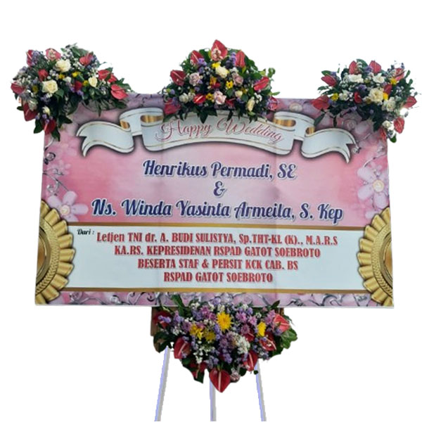 Karangan bunga papan ukuran panjang 2 meter x lebar 1,25 meter dengan 4 titik bunga segar untuk bunga papan di Denpasar dan sekitarnya. Untuk bunga papan pernikahan, bunga papan duka cita, bunga papan selamat & sukses/congratulations.
