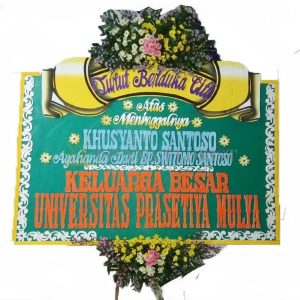 Karangan bunga papan menggunakan styrofoam ukuran 2 m x 1,25 m dengan 3 titik bunga segar untuk bunga papan di Kediri dan sekitarnya. Untuk bunga papan pernikahan, bunga papan duka cita, bunga papan selamat & sukses/congratulations.