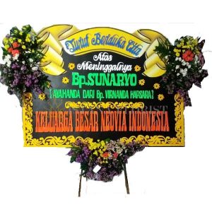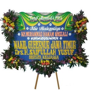 Karangan bunga papan menggunakan styrofoam ukuran 2,5 m x 1,25 m dengan bunga segar membingkai papan untuk bunga papan di Kediri dan sekitarnya. Untuk bunga papan pernikahan, bunga papan duka cita, bunga papan selamat & sukses/congratulations.