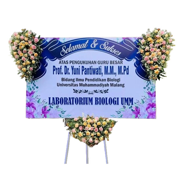 Karangan bunga papan model printing ukuran 2,2 m x 1,3 m dengan 3 titik bunga segar untuk bunga papan di Malang dan sekitarnya. Untuk bunga papan pernikahan, bunga papan duka cita, bunga papan selamat & sukses/congratulations.