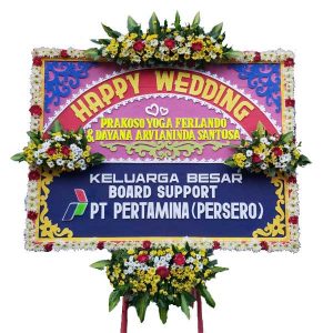Karangan bunga papan ukuran panjang 2 meter x tinggi 1 meter dengan 3 titik bunga segar untuk bunga papan di Solo dan sekitarnya. Untuk bunga papan pernikahan, bunga papan duka cita, bunga papan selamat & sukses/congratulations.