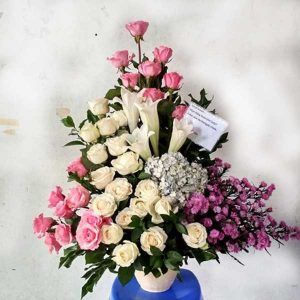 Rangkaian bunga meja / table bouquet untuk pengiriman ke Jogja dan sekitarnya yang dirangkai cantik untuk bunga meja kado ulang tahun, bunga meja wisuda, table bouquet opening kantor/ cafe/restoran, table bouquet anniversary, atau bunga meja ucapan semoga lekas sembuh, dan lainnya.