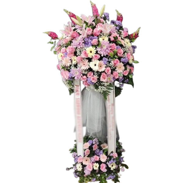 Rangkaian standing flower 2 tingkat dengan full bunga segar berkualitas mawar putih, baby breath, lily di Surabaya dan sekitarnya. Untuk ucapan acara pernikahan, ucapan duka cita, ucapan ulang tahun, kado bunga anniversary, bunga wisuda, opening kantor/restaurant.