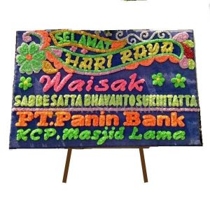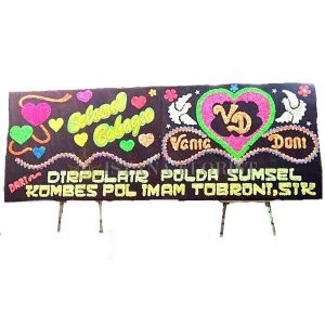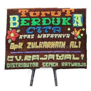 Krans bunga dengan penyangga kayu 2 susun, dihias dengan ucapan styrofoam & pita. Tinggi rangkaian -+ 1 meter.